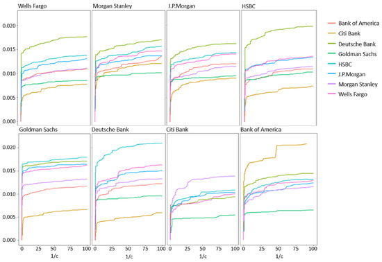 Estimated PI of eight large banks in the U.S. stock market, calculated as a function of the inverse of the pruning constant c. Shuffled input time series showed maximum PI values of ≈.