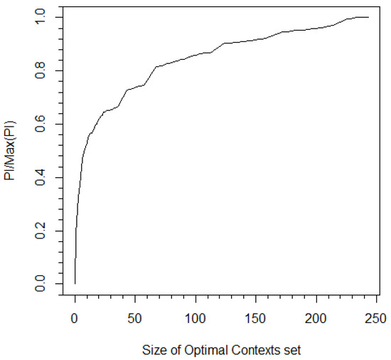 where is the empirical PI obtained from the I/O CT algorithm with a pruning constant c and is its corresponding optimal context set. To continue with the running example of banks’ data, we use Table 1, which represents the tree in Figure 1; using Equation (7), with c = 1 can be calculated as follows: