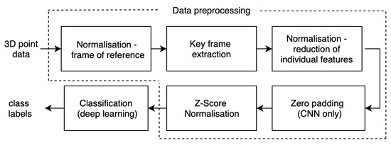 Next, all sequences are subjected to z-score normalisation, which is a widely used step to accelerate the process of neural networks learning [37,38,39]. For the purpose of this research we apply sequence-wise normalisation [38] for each key frame sequence. In this method, mean and standard deviation is calculated among data from all sequences excluding zero frames added during the previous step.