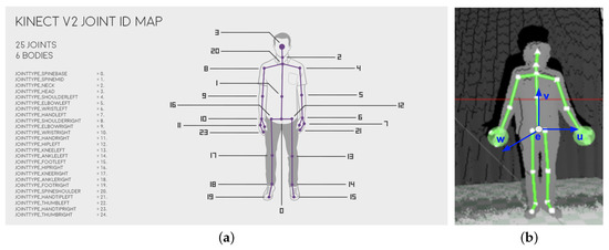 Data acquired from the Kinect v2 determines the 3D position and orientation of 25 individual joints, as shown in Figure 3a. The position of each joint is defined by the vector , where the basic unit is and the origin of the coordinate system is Kinect v2 sensor itself. The orientation is also determined with three values expressed in degrees. The device does not return orientation values of head, hands, knees and feet.