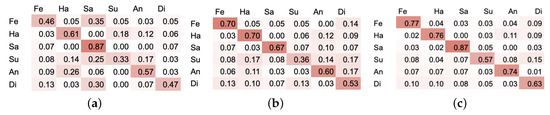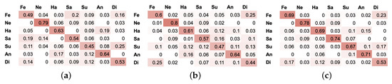 Confusion matrices for (a) CNN on P set with 3 cm error rate (b) RNN on P set with 3 cm error rate (c) RNN-LSTM on P set with 3 cm error rate. Six emotional states: Fe—fear, Ha—happiness, Sa—sadness, Su—surprise, An—anger, Di—disgust.