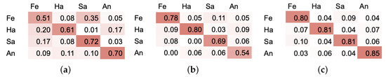 Confusion matrices for (a) CNN on P set with 3 cm error rate (b) RNN on P set with 3 cm error rate (c) RNN-LSTM on P set with 3 cm error rate. Four emotional states: Fe—fear, Ha—happiness, Sa—sadness, An—anger.