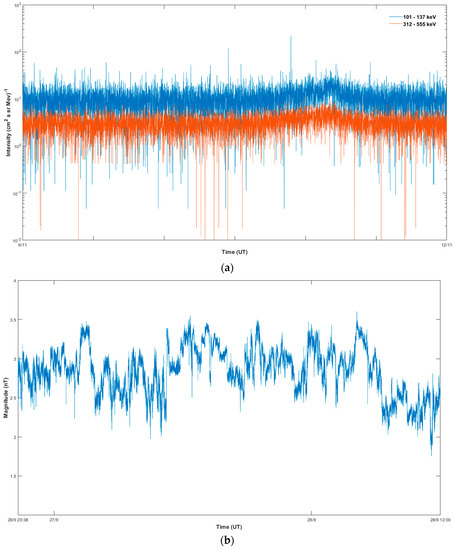 Quiet period observed during the identified “quiet” periods for: (a) Energetic ion intensities; (b) magnetic field.