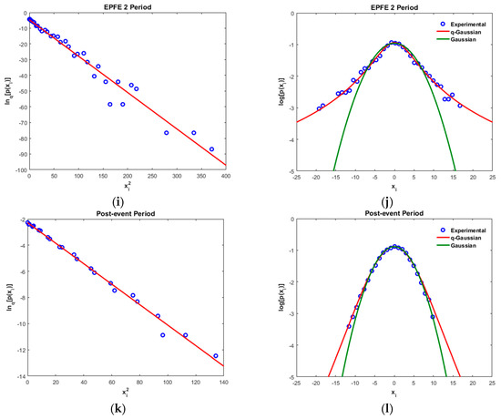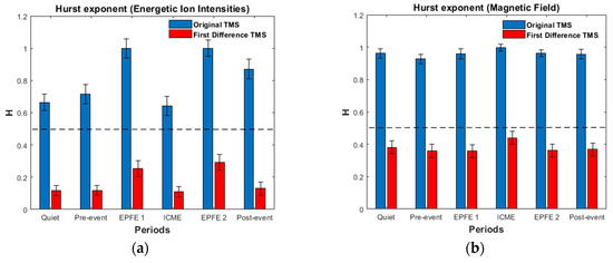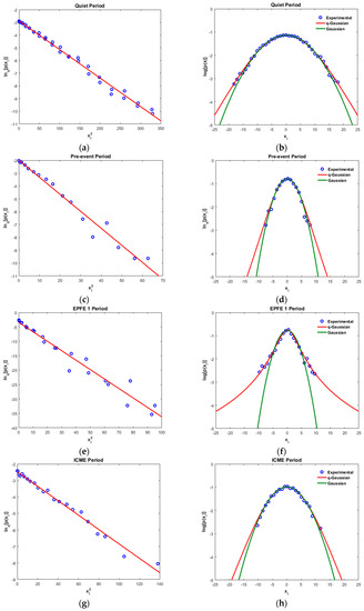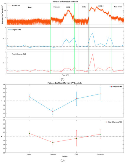In the following we present results concerning the magnetic field, as we have significant theoretical reasons to believe the existence of physical connection of the magnetic field and the energetic particle profiles (see Appendix A.1.1–Appendix A.1.3). In the magnetic field TMS (original and first difference), the non-Gaussian character is presented during all periods as the coefficient F takes values , much higher than the Gaussian value (F = 3). In particular, the enhancement of non-Gaussian character is observed for pre-event, EPFE 2, and post-event periods, as the Flatness coefficient during these periods increases to much higher values than the other periods (quiet, EPFE 1, ICME). It is noticeable that during the pre-event period there is a strong enhancement of the non-Gaussian character of the magnetic field. According to our theoretical framework (see Appendix A), the enhancement of magnetic field non-Gaussian character must be generally related someway to the energetic particles enhancement. However, this concept must be further testified by using rich statistics of SMIs events.
