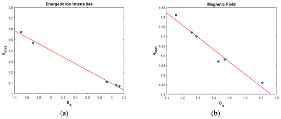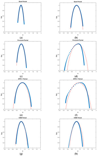 Figure 6 shows the related singularity spectrum as a function of singularity strength for energetic ion intensity, Figure 6 (left column), and magnetic field, Figure 6 (right column), TMS, corresponding to six periods (quiet, pre-event, EPFE 1, ICME, EPFE 2, and post-event) as captured from the STEREO A spacecraft. The red dashed line is a nonlinear regression best fit of the experimental data making use of an analytical expression for tow-scale Cantor set with equal scales but unequal weights (p-model). As one can see in Figure 6, the multifractal character changes as we pass from the quiet to the next periods and becomes stronger during the EPFE periods. However, there are significant differences between the multifractal curves which can be quantified using the Tsallis index, as well as other geometrical characteristics of the singularity spectrums such as the value , the degree of multifractality , the degree of asymmetry A, and the generalized dimension spectrum [77,78].