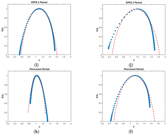 Singularity spectrum for energetic ion intensity (left column) and magnetic field (right column) TMS, shows the related singularity spectra as a function of singularity strength . The red dashed line corresponds to a nonlinear regression best fit of the data (p-model): (a,b) Quiet periods; (c,d) pre-event periods; (e,f) EPFE 1 periods; (g,h) ICME periods; (i,j) EPFE 2 periods; (k,l) post-event periods.