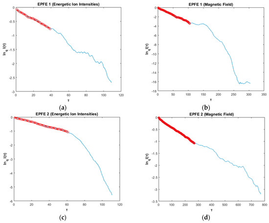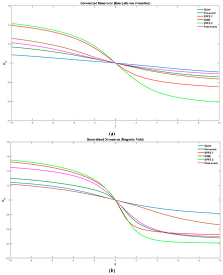 Moreover, the estimation of the degree of multifractality showed that is greater during the EPFE 1 and EPFE 2 periods. Thus, higher values of indicate that the underlying process is richer in fractal terms, meaning that both the energetic particle ions and magnetic field exhibits more complex multifractal properties during the EPFE periods, than the corresponding quiet, ICME, pre-event, and post-event periods.