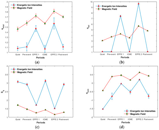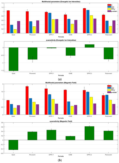 First, we present results concerning parameters describing the geometrical properties of the curve of singularity spectrum . Comparing the values of the four parameters obtained from the singularities spectrum, we observe the followings: The parameter for EPFE 1 and EPFE 2 periods was found to be higher than the other periods (Table 3). Similar results obtained for the magnetic field TMS (Table 4). Therefore, is smaller for the spectrum of quiet, ICME, pre-event and post-event periods, in both cases of energetic ion intensity and magnetic field TMS. Smaller values of indicate underlying processes with rather regular appearance (e.g., smoother TMS) since is an indicator of the strength of the largest fluctuations [79]. Therefore, our estimation of for the analyzed event denotes that the energetic ion flux variations observed during the quiet, ICME, pre-event, and post-event periods are more regular (e.g., less erratic) than the corresponding ones occurring during the EPFE 1 and EPFE 2 periods.