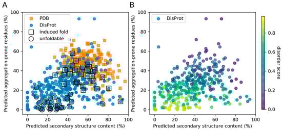 Scatter plot showing predicted secondary structure content (x-axis) and aggregation propensity (y-axis) of the PDB (blue) and DisProt (orange) datasets. The Disprot dataset is further annotated for classified examples of induced fold (by squares) and unfoldable (by circles) intrinsically disordered proteins (IDPs) in (A), which belong also to the most disordered Disprot predicted proteins by MobiDB-lite score in (B).