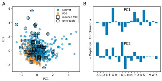 Compositional distribution of the PDB and DisProt datasets. Projections to the principal components (PC1 and PC2) are presented in (A), the Disprot dataset has the induced fold (squares) and unfoldable (circles) representatives highlighted. Contributions of individual amino acids to PC1 and PC2 are visualized in (B).