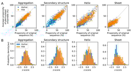 Both datasets were completely permuted 1000 times on the sequence level (conserving the composition of individual proteins) and compared with the original sequence to identify properties that have been significantly affected by evolution on the level of amino acid sequence. No significant effects on aggregation and secondary structure propensities were observed using the predictors after sequence permutations, i.e., there was notable correlation of the properties of original and permuted sequences (Pearson’s r in the range of 0.73–0.94 for all datasets properties) (Figure 3). This suggests that the role of composition (versus particular sequences) on these properties is dominant. Protein composition generally determines the spectrum of properties that a specific sequence can occupy, and this spectrum is especially narrow for aggregation propensity (Figure 3A). A minor role of the sequence is observed in favor of secondary structure formation of PDB proteins (Figure 3B, secondary structure) and against beta-sheet formation of DisProt proteins (Figure 3B, sheet), as deduced from the z-score related to the original sequence in the distribution of its permuted variants.