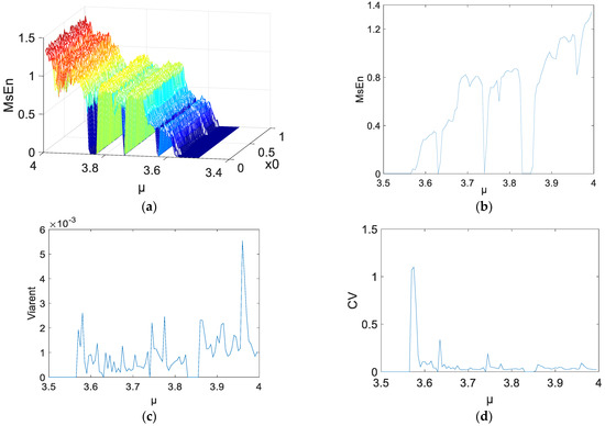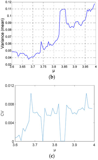 - Figure 2c,d indicate the variance and coefficient variables of a sequence at N = 2000. The mean value of the variances, excluding the maximum and minimum values, is about 0.0012. There are 23 coefficient of variable (CV) that exceed 5%, including the value near the parameter μ = 3.57, and the sequence is not in a completely chaotic status. Figure 3c,d indicate the variances and coefficient variables of sequences at N = 5000. The maximum variance is . The remaining points are not more than , other than the points near . The range of coefficient variables is from 1% to 3%. In other words, the changes of the initial value do not change the MSE values of the series. Not all chaotic characters of the logistic system have dependency on the initial value. For this, it is possible to make a reasonable estimation and prediction on a chaotic system from macroscopic perspectives.