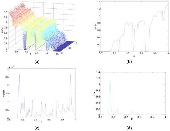 Substantial experiments with different parameters were carried out in order to obtain extensive results. More representative results were selected and are shown in Figure 1, Figure 2 and Figure 3. N = 1000, 2000, and 5000 were chosen as the lengths for the chaotic sequences. Set the parameters of MSE as m = 2, and r = 0.15. The scale factor was τ = 2. The initial values were . The step was 0.01; 100 points were utilized. The parameters were , and the step was 0.005. Calculate the MSE of the logistic chaotic time series. Figure 1 shows the analysis results of MSE for the time series N = 1000, where Figure 1a is a 3D figure of the MSE results, Figure 1b is the means of different MSE values when μ is fixed, Figure 1c shows the variances of the MSE values, and Figure 1d is the coefficient variables of a different μ.