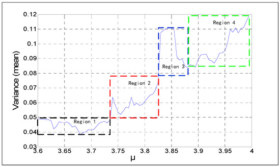 According to the previous study, the initial value x0 does not impact the MSE values of a chaotic series. If a chaotic series has adequate length, the current value of x is a key. Parameter μ is the only key involved. Figure 4b divided into four regions is shown in Figure 5. The relations of the four sections are arranged in Table 1, which are the variances and μ. The range of the parameter μ can be obtained by calculating the variance of a sufficiently long chaotic sequence. Despite the fact that the exact value of the parameter cannot be obtained, it reduces the key space of the sequence to some extent. When the variance of the sequence belongs to Regions 1 or 2, the corresponding range of μ is unique and does not overlap with the other. But if the variance is in Regions 3 or 4, because there are some overlaps in the two regions, the parameter μ is harder to determine. The specific variance of the corresponding parameter μ is shown in Table 1.