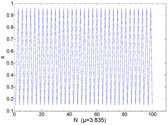 where xn is the status value of the logistic mapping, and parameter μ is the coefficient of the iterative equation. The chaotic phenomenon is induced by adjusting μ. Within the range of μ ∈ (3.57, 4], the logistic mapping induces the chaotic phenomenon. If the parameter μ and the initial value of system x0 are given, an iterative computation by Equation (1) can obtain the logistic sequence at random lengths. According to the different parameter of μ, the following situations take place after substantial iterations: