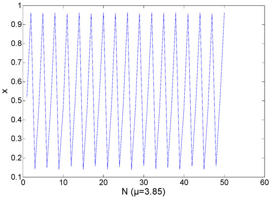 In Region 3, the range of μ is from 3.825 to 3.865. As shown in Figure 6, in this region, the chaotic sequences are periodical, while in other regions they are opposite. Figure 7 shows the logistic chaotic mapping at μ = 3.835. Figure 8 shows the logistic mapping at μ = 3.85. In general, the parameter μ of Region 3 is not selected, because of its periodical. If the variance of a sequence is in Regions 3 or 4, Region 4 will have a higher probability.