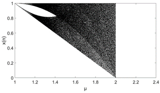 Chaos, as a classical complex phenomenon of a nonlinear dynamic system, is widely used in military and commercial spread spectrum communication systems with high demands for secrecy, because of its characteristics of wideband, quasi-noise, and sensitivity to initial state [1]. The chaotic system, a logistic chaotic map, has been paid much attention by researchers and has been studied extensively. In 1978, Feigenbaum [2] made a detailed analysis of its mathematical properties. The literature [3] has realized the bifurcation control of the multiple periods of the logistic model. The authors of [4] discussed the influence of delay time on the transition probabilities between the metastable state and the stable state of a logistic system. The authors of [5] applied the model to the evolution of biomolecular networks. The authors of [6,7] made a detailed description of the bifurcation and fractional dimension of the multiple complex logistic systems. The authors of [8] studied the chaotic fractal characteristics of C-K mapping, which is partially similar to logistic sequences. It can be seen that the logistic model has had a lot of research done on its local features, and these research work plays an important role in the field of information communication.