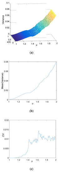 Results of variance analysis for N = 104: (a) 3D figure of variance with different initial series; (b) the means of variances for different initial values; (c) CV of a different μ.