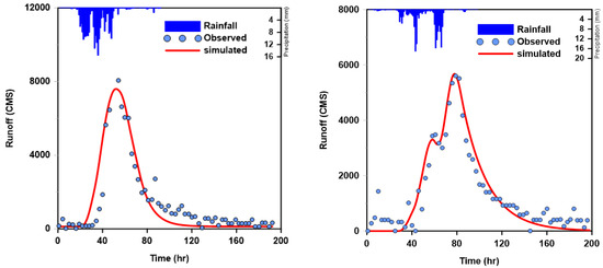 For the analysis of rainfall–runoff, the subdivision of the basin that has a stream gauge station into outlets should be preceded in order to determine the runoff characteristics through a comparison between the runoff analysis model and the observed data. To construct the HEC-HMS model, a rainfall loss process, basin routing method, and channel routing method are required. The NRCS (Natural Resources Conservation Service) method is applied to the rainfall loss process, the Clark unit hydrograph method for basin routing, and the Muskingum method for channel routing. For the initial values, to calculate the parameters of the Clark unit hydrograph, the Kraven (II) formula and the Sabol formula were used. The Thiessen method was used to obtain the areal average rainfall. In addition, the Antecedent Moisture Condition (AMC-III) was applied to maximize the flood peak. The observed rainfall events in the period from June to September (rainy season), where the flood peak is usually high, were selected, and the parameters were verified and calibrated with the observed flow values, as explained above. Table 3 and Figure 2 show the results of rainfall–runoff analysis, for which the study completed verification and calibration by using the rainfall events applied to the optimization of the parameters and inflow data for the target area.