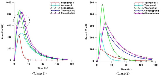 For the two cases, unit hydrographs were calculated. As a result, the unit hydrographs developed on the basis of rainfall–runoff events (Case 1) did not show a curve as gentle as that in Case 2 (see Figure 3). This was the result of the runoff characteristics varying between the upper stream and the downstream. This phenomenon occurs as the runoff of a downstream section is directly influenced by the characteristics of the upper stream’s runoff characteristics. In addition, Chungju Dam in the lowest downstream section had a lower flood peak compared to its upper sections, Yeongchun and Cheongpyeong, due to topographical influence. In other words, at the Yeongchun and Cheongpyeong points, which have a high share of steep slopes, the flood peak sharply increased, but at the same time, discharged rapidly. Meanwhile, the Chungju Dam basin, which has a gentle slope and a slow flow rate, showed a significant effect of the channel storage, which led to the low flood peak and the slow discharge. Therefore, Yeongchun had the highest peak flow, followed by Cheongpyeong and the Chungju Dam.
