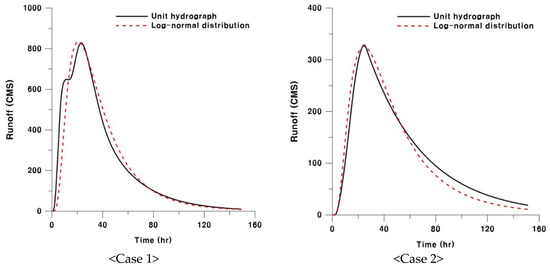 Real runoff curves are dependent on the rainfall pattern. It is difficult to convert the real runoff curve to a probability density function, because the real runoff curve has an irregular pattern. The unit hydrograph of a watershed is defined as a direct runoff hydrograph resulting from one unit of excess rainfall generated uniformly over the drainage area at a constant rate for an effective duration. For the construction of an optimal gauge network using entropy, unit hydrographs to be converted to probability density functions are required. For Case 1, unit hydrographs were derived with the observed rainfall–runoff events. Case 2 based on the empirical formulas is applied when there is no observation data.
