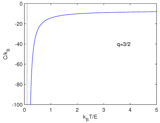 Figure 1 depicts the specific heat corresponding to Equation (31). One defines with and express our quantities in -units. The specific heat is negative, as Astrophysics indicates for gravitation [1]. This property has been linked to self-gravitational systems [1].