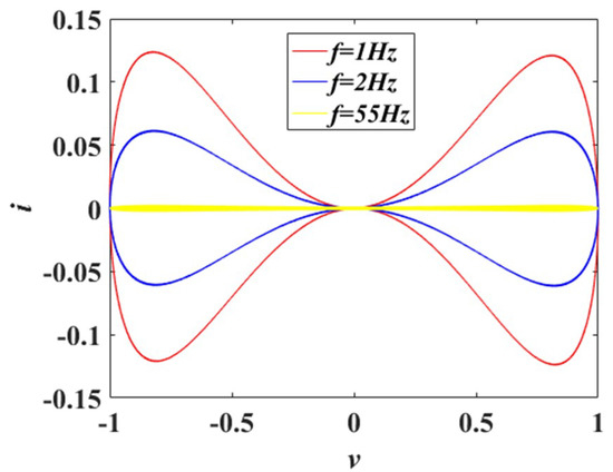When a voltage signal v = vmsin(2πft) with amplitude vm and frequency f is applied to the memristor, the v–i pinched hysteresis loops of the proposed memristor with amplitude vm = 1 V and different frequencies f are depicted in Figure 1.