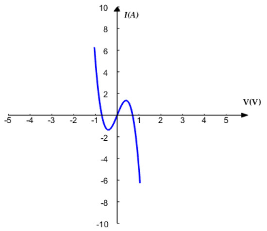 A memristor is a nonlinear two-terminal circuit element reflecting the relationship between charge and magnetic flux, which was first predicted by Chua in 1971 [1]. Reference [2] introduced the general definition of memristor and its three fingerprints. Then, in 2008, the realization of a nanoscale memristor was first reported by the Hewlett-Packard laboratory [3]. A locally active memristor was proposed by Chua, which can generate complex behaviors in nonlinear dynamical systems [4]. The DC V–I plot is a smooth curve passing through different voltages V and corresponding currents I on the V–I plane, which can be used to show that a memristor is locally active [5]. Because of its unique properties, a memristor can be used in many areas such as nonlinear chaotic circuits [6,7,8,9], artificial intelligence [10,11,12], electronic engineering [13,14,15], neural networks [16,17,18], and so on.