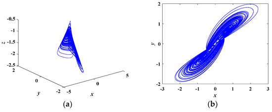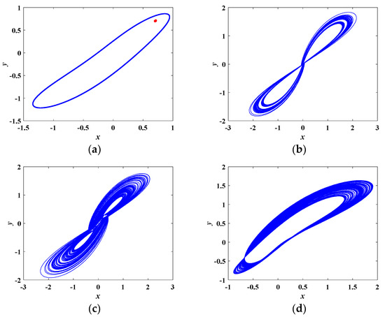 More specifically, various phase portraits with different a are depicted in Figure 8. In Figure 8a, when a = 1.5, the red trajectory converges to the stable equilibrium point (0.7071, 0.7071, −1.2500). When a = 5.5, the blue trajectory is a limit cycle, implying the system is in periodic state. Different kinds of chaotic attractors are plotted in Figure 8b–d. Figure 8b,c depict two kinds of twin-scroll chaotic attractors. The single-scroll chaotic attractor is shown in Figure 8d.