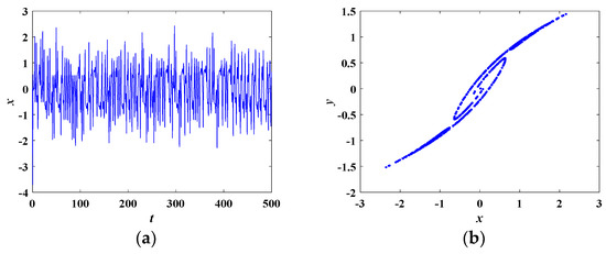 When the parameters of Equation (8) are set as in Table 1 and the initial conditions are (0, 0.1, 0), the system is in a chaotic state. In this condition, the Lyapunov exponents are calculated as LE1 = 0.4369, LE2 = 0, LE3 = −2.0762. The corresponding chaotic attractors on the x-y-z, x-y, y-z, x-z planes are depicted in Figure 4. The time domain waveform of the state variable x(t) is shown in Figure 5a. Figure 5b demonstrates the corresponding Poincare mapping on z = −1.3 section. The time domain waveform and Poincare mapping shown in Figure 5 indicate that the system was chaotic.