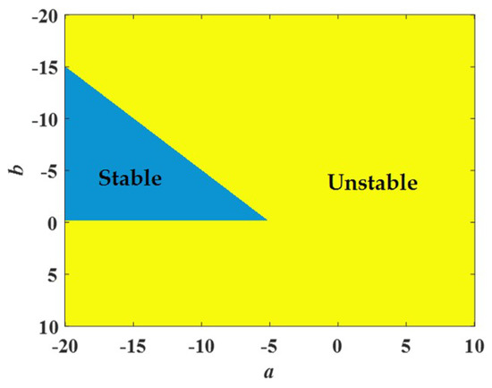 As shown in Figure 6, the region of a ∈ [−20,10] and b ∈ [−20,10] can be divided into two parts. The blue part satisfies the above equation, so it represents a stable region. Conversely, the yellow part belongs to an unstable region.