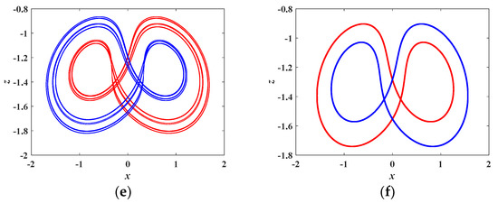 When a = 4.5, c = 0.4, d = 1, m = 5, n = 4, and b is set as different values, a variety of coexisting attractors with initial conditions of (0, 0.1, 0) and (0, −0.1, 0) are obtained, as plotted in Figure 10, where the red orbit starts from the initial conditions of (0, 0.1, 0), and the blue one starts from the initial conditions of (0, −0.1, 0). Figure 10a,b depicts two kinds of a symmetric pair of single-scroll attractors. Figure 10c,d depicts two kinds of a symmetric pair of twin-scroll attractors. Two kinds of a symmetric pair of limit cycles are shown in Figure 10e,f.