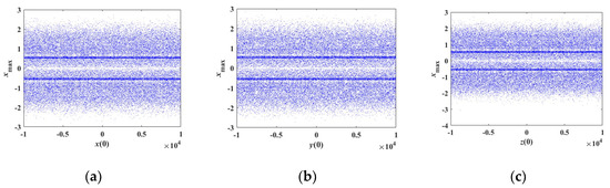 If the system parameters are as in Table 1 with initial conditions of (x(0), 0.1, 0) in which x(0) is the bifurcation parameter, the bifurcation diagram of the state variable x and the corresponding Lyapunov exponent spectra are as shown in Figure 12a and Figure 13a, respectively. It is obvious that the Lyapunov exponents of the proposed system almost remain constant under the initial conditions of (x(0) ∈ (−1 × 104, 1 × 104), 0.1, 0). If the initial value y(0) is regarded as the bifurcation parameter and x(0) = z(0) = 0, the bifurcation diagram of the state variable y and the corresponding Lyapunov exponent spectra are as shown in Figure 12b and Figure 13b, respectively. The corresponding Lyapunov exponents are approximately the same under the initial conditions of (0, y(0) ∈ (−1×104, 1×104), 0). Similarly, the Lyapunov exponents are constant under the initial conditions of (0, 0.1, z(0) ∈ (−1×104, 1 × 104)). The bifurcation diagram of the state variable z and the corresponding Lyapunov exponent spectra with initial conditions of (0, 0.1, z(0) ∈ (−1×104, 1×104)) are shown in Figure 12c and Figure 13c, respectively.