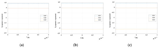 Corresponding Lyapunov exponent spectra varying with different initial values. (a) Variation with initial value x(0), (b) variation with initial value y(0), (c) variation with initial value z(0).