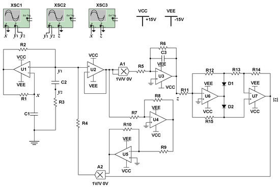 In Figure 14, the specific capacitance and resistance parameters were set as C1 = 11 nF, C2 = 9 nF, R1 = R2 = 10 kΩ, R5 = 4 kΩ, R6 = 10 kΩ, R7 = R8 = 1 kΩ, R9 = 5 kΩ, R10 = 4 kΩ, R11 = R12 = R13 = R14 = R15 = 10 kΩ. Other capacitance and resistance parameters could be calculated as: C3 ≈ 2.5 μF, R3 ≈ 202 kΩ, R4 ≈ 182 kΩ. In this analog circuit, the type of operational amplifiers U1–U7 was OP07CP, and the type of multipliers A1–A2 was AD633. XSC1, XSC2, and XSC3 were oscilloscopes. D1 and D2 were diodes.