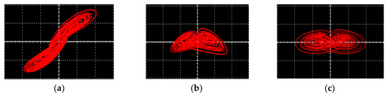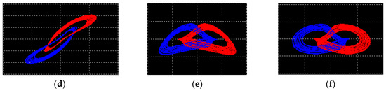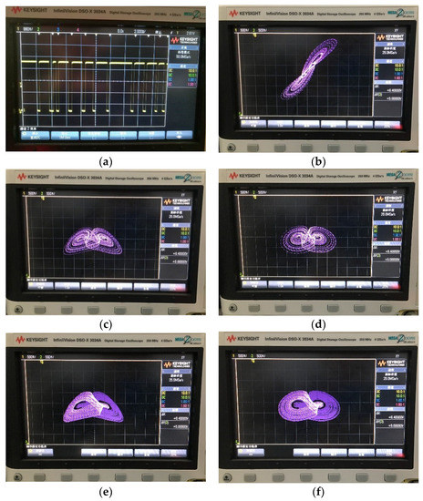 The simulation results obtained from oscilloscopes by the Multisim software are shown in Figure 15. Figure 15a–c are phase portraits of the attractors. Figure 15d–f are phase portraits of coexisting attractors, where the red orbit starts from the initial conditions of (0, 0.1, 0), and the blue orbit starts from (0, −0.1, 0). It is obvious that the simulation results matched well with the numerical simulation results.