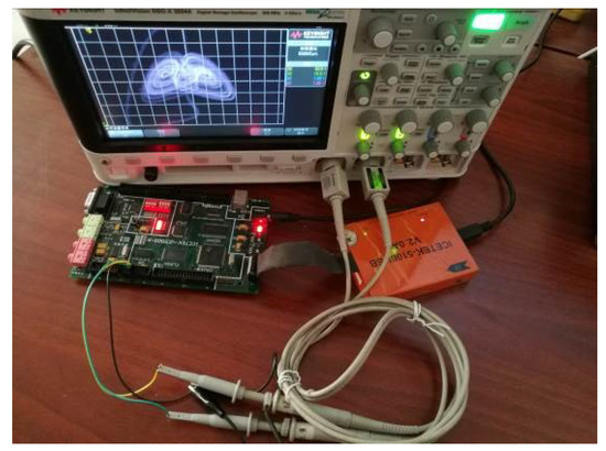 The digital signal was obtained by solving Equation (19) in a digital signal processor. The chaotic pseudo-noise (PN) sequence extracted from the variable x is shown in Figure 16a. In order to observe the analog signal in an oscilloscope, the digital signal was input into an 8-bit D/A convertor. The output phase portraits of the chaotic attractor are shown in Figure 16b–d. The phase portraits of coexisting attractors are shown in Figure 16e,f, where the trajectory on the left starts from the initial conditions of (0, −0.1, 0), and the right trajectory starts from the initial conditions of (0, 0.1, 0). The experimental equipment is shown in Figure 17. In the experimental equipment, the type of evaluation board was ICETEK-VC5509-AE, and the core processing chip was TMS320C5509.