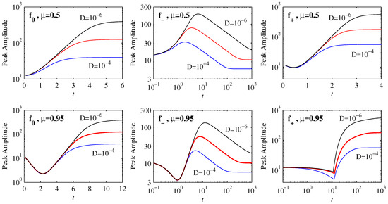 Figure 2 shows how the peak amplitudes evolve in time for the three choices , and . Starting with the initial position in the top row, we see that the solutions for and equilibrate to their final values on very rapid timescales, involving relatively little variation with D. In contrast, the timescales for are much longer, and vary substantially with D. Comparing the results here with Figure 1 in [15], we see that is exactly analogous to the previous . This is because for the shape of is very close to a cubic. Similarly, for the shape of is still reasonably close to linear, and the evolution is therefore essentially like the linear Ornstein–Uhlenbeck process , for which an exact analytic solution exists [21].