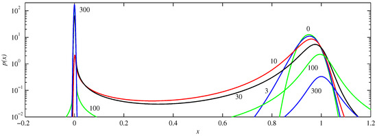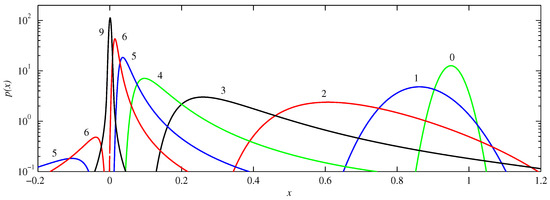 Figure 3, Figure 4 and Figure 5 illustrate these various behaviours in more detail, showing the actual PDFs at different times for , and , respectively. Starting with , we see how the peak initially located at becomes broader as it moves toward the origin, an effect again not caused by diffusion, but rather by the curvature of at these values of x. Note for example how the solutions at or 4 have much steeper leading edges (nearer to the origin) than trailing edges, caused by the trailing edges moving so much slower. Another feature to note is how parts of the solution reach the origin coming from the ‘other’ direction. That is, if the initial condition is a peak centred at , and having half-width 0.07 (corresponding to ), then a small but non-negligible portion of the initial condition is in the range , as seen also in Figure 3. For this part of the initial condition the nearest attractor is rather than . Viewed on the interval , this part therefore approaches from negative x values, as seen at times and 6. (The interval or equivalently is not shown in these figures because the amplitudes are rather small there, due to the PDFs being very spread out as they traverse this range). Finally, between and 9 we see how the two peaks coming from negative and positive x values combine to form the single final equilibrium consisting of a Gaussian centred at the origin.