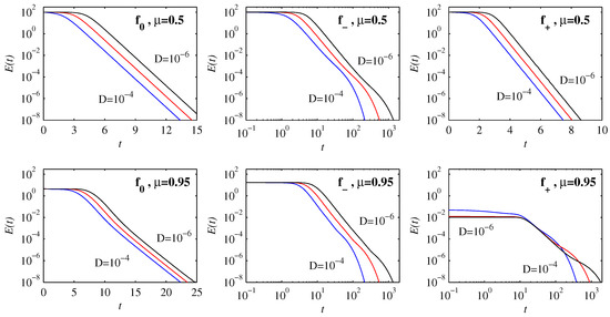 As noted in the introduction, we are particularly interested in the effects that these various different types of behaviour have on the information length quantities and . Figure 6 shows for the same solutions as before in Figure 2. We see that is initially uniform, and independent of D (provided D is sufficiently small in comparison with ), corresponding to the ‘geodesic’ behaviour first identified by [6]. For some configurations, then immediately transitions to an exponential decay, whereas for others it first has a power-law decay before ultimately decaying exponentially. Correspondingly, the timescales to achieve also vary dramatically, as seen by the various linear and logarithmic scales for t. Different scaling regimes signify fundamentally different dynamics.