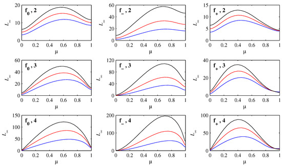 Figure 7 shows how varies with , for to , and to within each panel. It is interesting to note how the shapes generally mimic the corresponding functions , and . The largest values always occur for intermediate values of , even though larger values correspond to initial conditions that have farther to travel to reach the origin. Such initial conditions also spread out much more though, as seen above, and according to the interpretation of information length, this should indeed reduce . Very close to the values are particularly small, because having peaks collapse in place and reform at the new location is an informationally very efficient way to move, as seen also in other contexts [13,22,23].