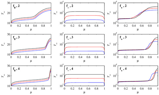 As in Figure 7, but now showing the time that it takes to achieve , that is, a measure of the time it takes to reach . Note how has a linear scale for , but logarithmic scales for and . The colour-coding is again blue, red, black.