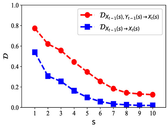 We generated data with the classical Hénon map, with the data length . In Figure 2, we show the values of normalized on multiple time scales . For , which corresponds to the original time series x and y, the degree of predictability was 0.77. This indicates that can be well predicted by using the past values of x and y. When the scale increased, the predictability of the coarse-grained time series decreased, as the relationship among , , and became weaker on large scales. We also compare with in Figure 2. Here, the lagged ranks p and q were both set to one. Obviously, if we only used the past values of x to predict , the predictability of the time series would be much lower than if we incorporated both the past values of x and y. Therefore, we always obtained . Actually, is just the normalized multiscale transfer entropy [5], and its unique scale case is the normalized transfer entropy [24,33], from y to x.