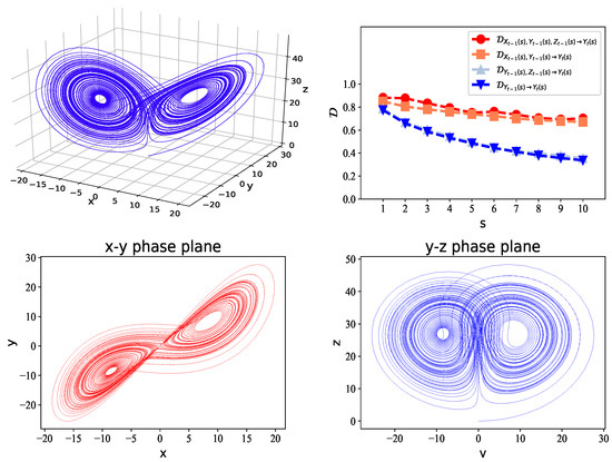 We used the Lorenz system to generate data of length . In Figure 3, we give the values of normalized on multiple time scales . For , which corresponds to the original time series x, y, and z, the degree of predictability of reached 0.88. This indicates that can be well predicted by using the past values of x, y, and z. When the scale increased, the predictability of the coarse-grained time series decreased, as the relationship among , , and became weaker on large scales. We also compared with , , and . Here, the lagged ranks p, q, and l were all set to one. We found that can be well predicted giving the past values of x and y. Interestingly, the past values of z contributed much less to predicting y, although in the second equation of the Lorenz system, the change of y () is also explained by z. This can be explained as follows. In the x–y phase plane, x is closely related to y in the “diagonal” direction, as shown in Figure 3. However, in the y–z phase plane, no obvious relationship appears between y and z. Therefore, both the past values of x and y contribute to predicting y, rather than z. To predict other variables like x and z, we obtained very similar results.
