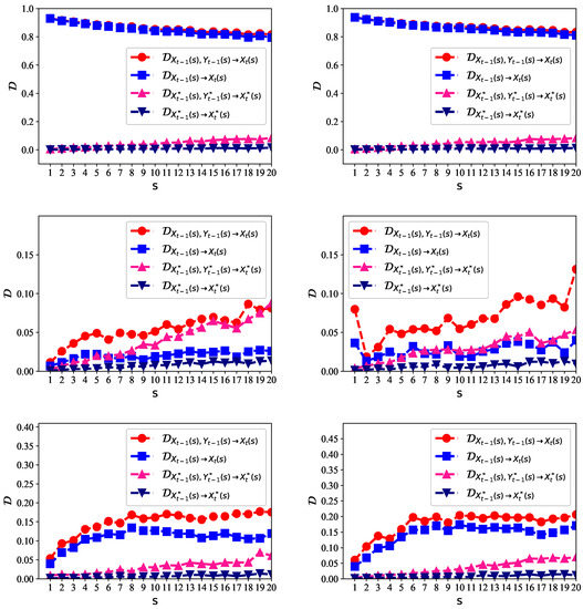 Next, we considered the Hénon map, which consists of two subsystems: and . The map depends on two parameters, a and b. For the classical Hénon map, it has values of and . There exists nonlinear information flow from and to , i.e., a one-step transition from the past data of one variable y to the current the data of another variable x. The initial values were set to .