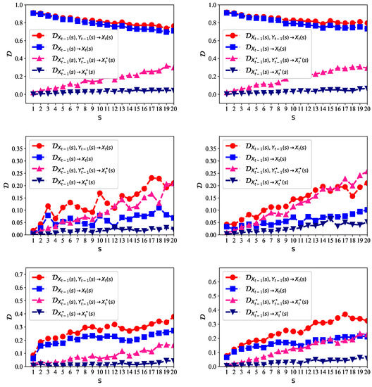Therefore, the normalization of by dividing D by makes it possible to compare the degree of predictability between different systems, even if they have different ranges of fluctuations. Moreover, regarding the estimation of entropy values from time series, there may exist biases for different estimators. The normalization can offset those biases caused by the estimation of entropy if the numerator and the denominator use the same estimator.