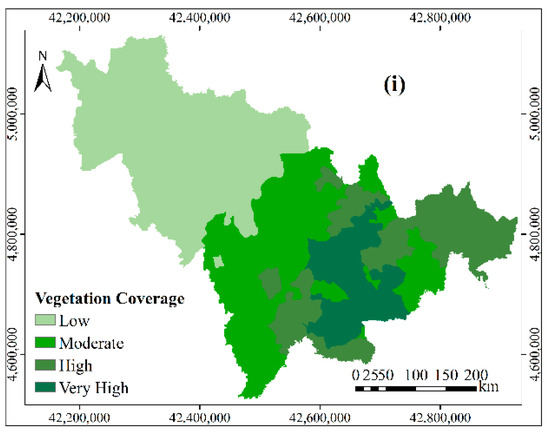 The lower the vegetation coverage is, the more easily the rock mass becomes weathered, and the more likely it is that debris flow will occur. In this study, the vegetation coverage of the eastern Changbai Mountains is more than 80%, while that of the western plain is less than 20%. The vegetation coverage in the central region is mainly between 20% and 50%. According to these critical values, vegetation coverage was divided into four classes: low (<20%), moderate (20%–50%), high (50%–80%), and very high (>80%).