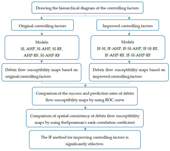 The methods that were used in this study can be summarized in three parts. The first part is the IF method for improving the controlling factors. The second part is the models for DFSM. Six models, i.e., SI, AHP, SI-AHP, SI-RF, AHP-RF, and SI-AHP-RF, were used to develop the debris flow susceptibility maps. The third part is the method that is used to verify the results. ROC curve analysis is used to verify the success rate and prediction rate of the debris flow susceptibility maps, and the Spearman’s rank correlation coefficients are used to verify the spatial consistency of the debris flow susceptibility maps. Figure 4 shows the flow of the research methods.