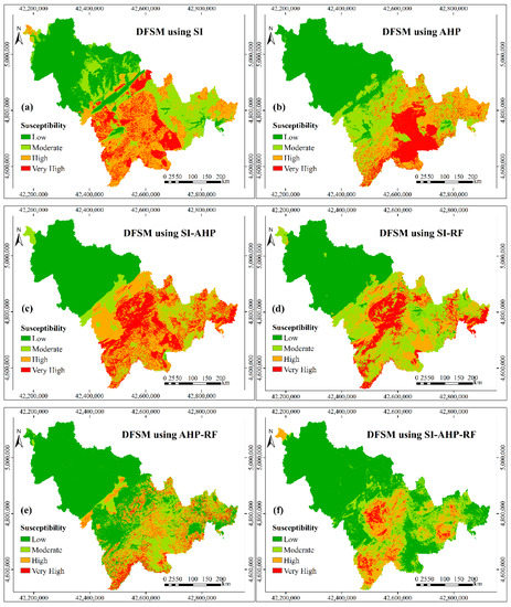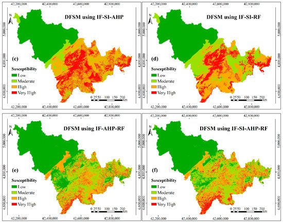Debris flow susceptibility maps based on the controlling factors before information fusion (IF): (a) debris flow susceptibility mapping (DFSM)using statistical index (SI); (b) DFSM using analytic hierarchy process (AHP); (c) DFSM using SI-AHP; (d) DFSM using SI-random forest (SI-RF); (e) DFSM using AHP-RF; and, (f) DFSM using SI-AHP-RF.