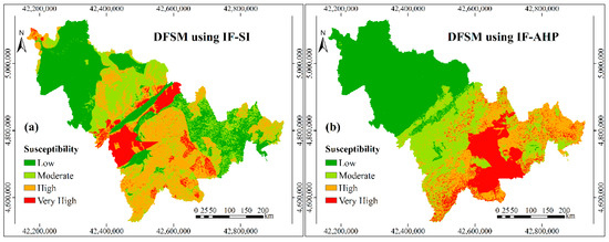 Based on the original controlling factors, the standardized weights, which are shown in the Table 3, were calculated by the selected six models, i.e., SI, AHP, SI-AHP, SI-RF, AHP-RF, and SI-AHP-RF. The debris flow susceptibility maps (Figure 5) were finally obtained by superimposing the layers of the controlling factors according these weights in the ArcGIS software. The susceptibility of debris flow was divided into four grades—low, moderate, high, and very high—according to the natural fracture method [56].